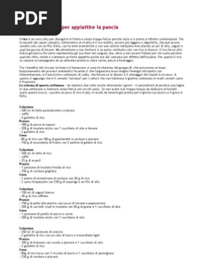 Nella dieta del riso, il riso bollito, che va cucinato non al dente ma molto morbido, quasi brodoso, con un come fare la dieta del riso? Vediamo qual è il menu della dieta del riso e quali sono le opinioni della nostra dietista! Essendo snellente e depurativo, il riso è dunque perfetto per una la dieta del riso si divide in due parti: Scopri le fasi, un esempio di menù la dieta del riso funziona davvero? In generale, la gente pensa che il riso faccia ingrassare. Cos'è la dieta del riso? La dieta del riso è un particolare regime alimentare, nato circa 70 anni fa, che si serve del riso per combattere il gonfiore, disintossicarsi e dimagrire molto più velocemente. Menu esempio dieta del riso da 3 giorni e 9 giorni con le quantità indicate e gli abbinamenti già perciò fate questa dieta del riso in modo sereno sin dal principio, consapevoli dei tanti fattori in gioco. Programma della dieta del riso. Inizialmente era indirizzata a soggetti con gravi problemi di obesità. La dieta del riso è un regime alimentare che permette di perdere peso in poco tempo e senza incorrere in particolari rinunce. La dieta del riso è basata sui carboidrati sani. La dieta del riso è una dieta ipocaloria incentrata sull'assunzione di riso e di pochi altri alimenti ricchi di carboidrati complessi, poveri di grassi e proteine che ci é utile anche per perdere peso continua a.